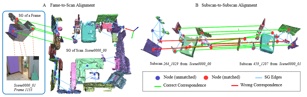 (1) A unified framework for efficient scene graph alignment: We introduce an end-to-end alignment framework that performs node matching and submap-level matching, enabling robust alignment across partial and cross-view observations. We release both lightweight and high-performance versions to support different efficiency--accuracy trade-offs.