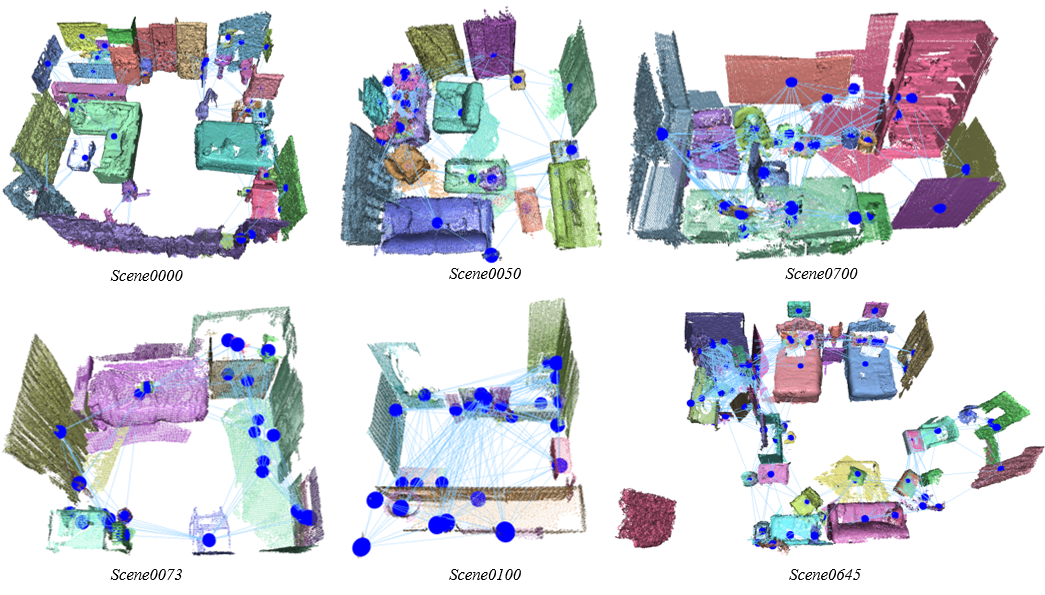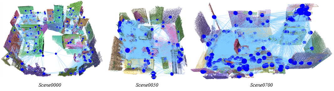 We build 3D scene graphs for the ScanNet dataset with object tags given by ScanNet human annotations and ChatGPT4o, respectively, in two groups. Blue lines show the edges connected by a distance threshold (< 2m). The image above shows scene graphs of six scenes built using tags from human annotations. Below we present another three scene graphs built using tags from ChatGPT4o. Object classes are much richer in the group using ChatGPT4o but could contain errors. We annotate 806 scenes in total using human annotated tags and 110 scenes in total using ChatGPT4o annotated tags.