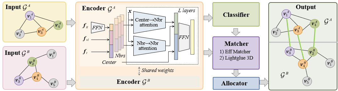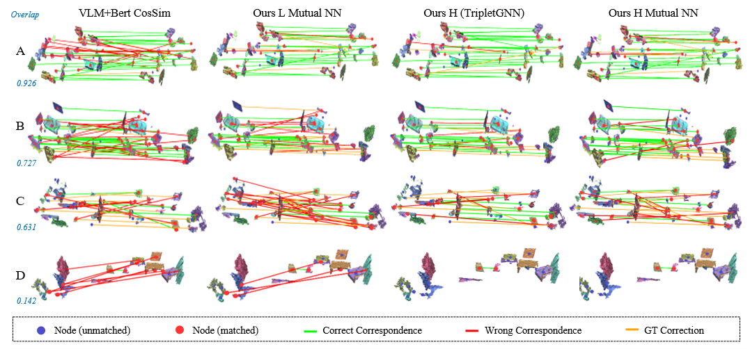 (2) Robust scene graph alignment network: We propose a distance-gated spatial attention encoder that encodes node context even under large coordinate discrepancies, together with a minimum-cost-flow-based many-to-one allocator for efficient and globally consistent matching.